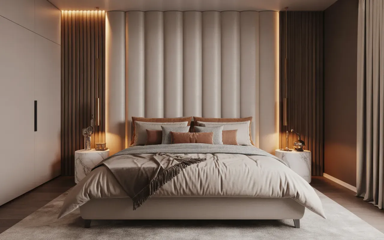 One common design mistake is focusing only on horizontal space while ignoring vertical opportunities. Tall headboards help balance the room visually by emphasizing height instead of width. In my experience, neutral fabrics like linen, velvet, or suede work best because they add texture without overwhelming the room. Combined with warm lighting and soft textiles, this design feature creates a polished bedroom that feels stylish, comfortable, and thoughtfully arranged.