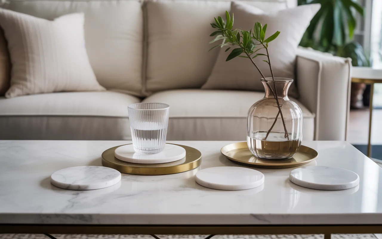 Marble coasters are a small detail that makes a big difference. They protect surfaces while adding a touch of elegance and visual interest. I’ve noticed that even minimalist living rooms feel more polished when small functional accessories like these are incorporated. Their natural veining adds subtle texture, enhancing the layered look of a well-styled coffee table or console.